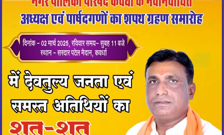 नगर पालिका परिषद कवर्धा के मुख्य नगर पालिका अधिकारी रोहित साहू ने बताया कि नवनिर्वाचित अध्यक्ष चंद्रप्रकाश चंद्रवंशी सहित सभी 27 पार्षदगणों का शपथ ग्रहण समारोह दिनांक 02.03.2025 को सरदार पटेल मैदान कवर्धा में आयोजित होगा। शपथ ग्रहण समारोह की आमंत्रण सूचना अध्यक्ष सहित पार्षदगणों को भेजा जा चुका है। सरदार पटेल मैदान में आयोजित होने वाले शपथ ग्रहण समारोह में कवर्धा शहर के सभी गणमान्य नागरिक, जनप्रतिनिधिगण व पत्रकार बंधु सहित कवर्धा की जनता के नाम आमंत्रण भेजा गया है उन्होनें कवर्धावासियों से अपील किया है कि शहर सरकार की प्रथम व्यक्ति के शपथ ग्रहण समारोह में शामिल होकर इतिहास की साक्षी बनें।