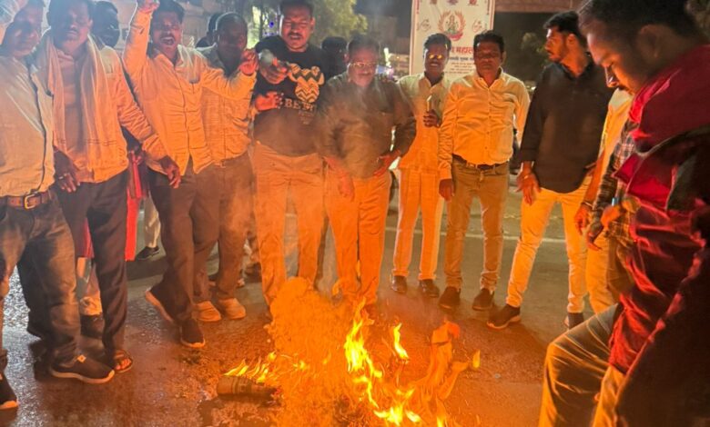 दामाखेड़ा कबीर आश्रम पर हुए हमले के विरोध में भाजयुमो ने फूंका कांग्रेस का पुतला।