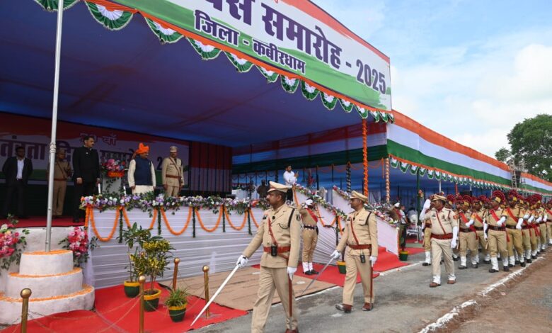 कवर्धा: कवर्धा जिला मुख्यालय के आचार्यपंथ गृंधमुनि नाम साहेब शासकीय स्नातकोत्तर महाविद्यालय मैदान में 79 वां स्वतंत्रता दिवस समारोह हर्ष्षोल्लास, उत्साह और उमंग के साथ मनाया गया। सांसद संतोष पाण्डेय ने मुख्य समारोह में ध्वजारोहण किया। ध्वजारोहण के पश्चात राष्ट्र गान एवं पुलिस जवानों की बैंड के राष्ट्रगान के धुन पर राष्ट्रीय सलामी दी गई। मुख्य अतिथि द्वारा जनता के नाम मुख्यमंत्री के संदेश का वाचन किया गया। मुख्य अतिथि ने उल्लास के प्रतीक रंगबिरंगे गुब्बारे आसमान में छोड़े। स्वतंत्रता दिवस के अवसर पर परेड कमांडर आरआई महेश्वर सिंह और सेकेण्ड कमाण्डर त्रिलोक प्रधान के नेतृत्व में 11 परेड दलों ने आकर्षक मार्चपास्ट कर मुख्य अतिथि को सलामी दी। इस अवसर पर 17 वीं वाहिनी, जिला पुलिस बल पुरूष-महिला, नगर सेना, फारेस्ट गार्ड, एनसीसी सिनियर बालक, बालिका पीजी कॉलेज, एनसीसी बालक, बालिका स्वामी करपात्री स्कूल, एनसीसी स्वामी आत्मानंद स्कूल और जिला गाईड टीम के स्काउड गाईड के परेड कमांडरों ने मुख्य अतिथि को सलामी दी। कबीरधाम जिले के 6 अलग-अलग शैक्षणिक संस्थानों के छात्र-छात्राओं द्वारा देश भक्ति एवं छत्तीसगढ़ की कला संस्कृति पर आधारित सांस्कृतिक कार्यक्रमों की शानदार प्रस्तुति दी। मुख्य अतिथि ने समारोह में उत्कृष्ठ कार्य करने वाले 90 अधिकारी कर्मचारियों को पुरस्कार वितरण कर सम्मानित भी किया। मंच पर मुख्य अतिथि के साथ कलेक्टर श्री गोपाल वर्मा और पुलिस अधीक्षक श्री धमेन्द्र सिंह विशेष रूप से उपस्थित थे।