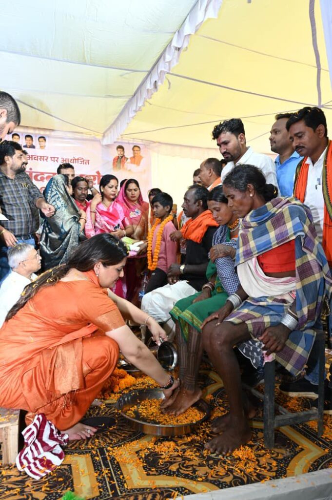 कार्यक्रम के दौरान विधायक भावना बोहरा ने न केवल इन आदिवासी और अन्य समाज के परिवारों का आत्मीय स्वागत किया बल्कि भारतीय परंपरा के अनुरूप स्वयं उनके पैर पखारे। इस भावुक क्षण ने उपस्थित जनसमूह को गहराई से प्रभावित किया। उन्होंने सभी परिवारों को श्रीफल व उपहार भेंट कर सम्मानित किया और उनके उज्ज्वल भविष्य की कामना की।